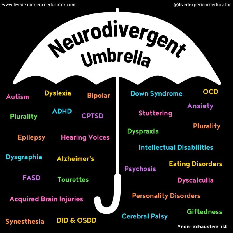 When we talk about neurodiversity, we typically tend to mean autism, ADHD, OCD, dyslexia, dyspraxia, and similar presentations. You may also have related conditions such as synesthesia or PDA.